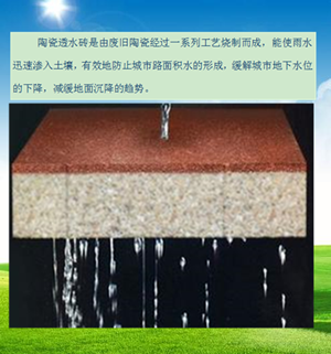 陶瓷透水磚是磚體透水,吸水,快速透水功能,可以防止地下水枯竭,減輕下水道的負擔。防止城市內澇,降低周邊環(huán)境溫度,改變熱島效應。另外,由于強大的透水功能,即使下雨走路也不濕鞋,不濺起。